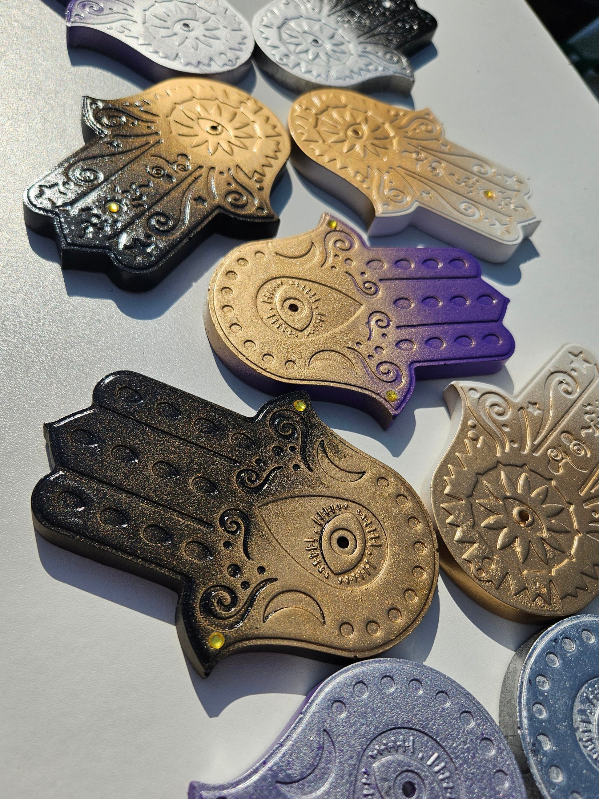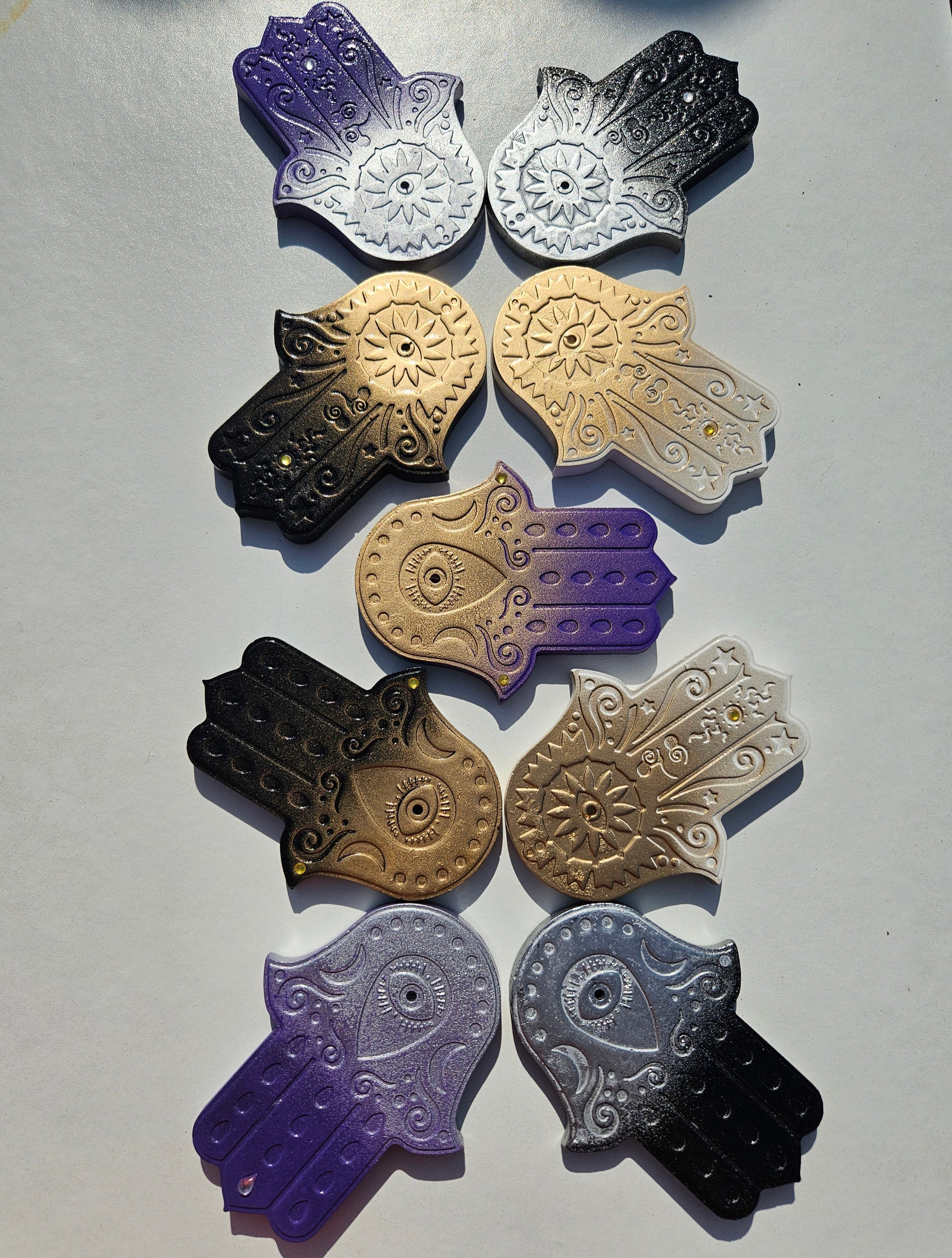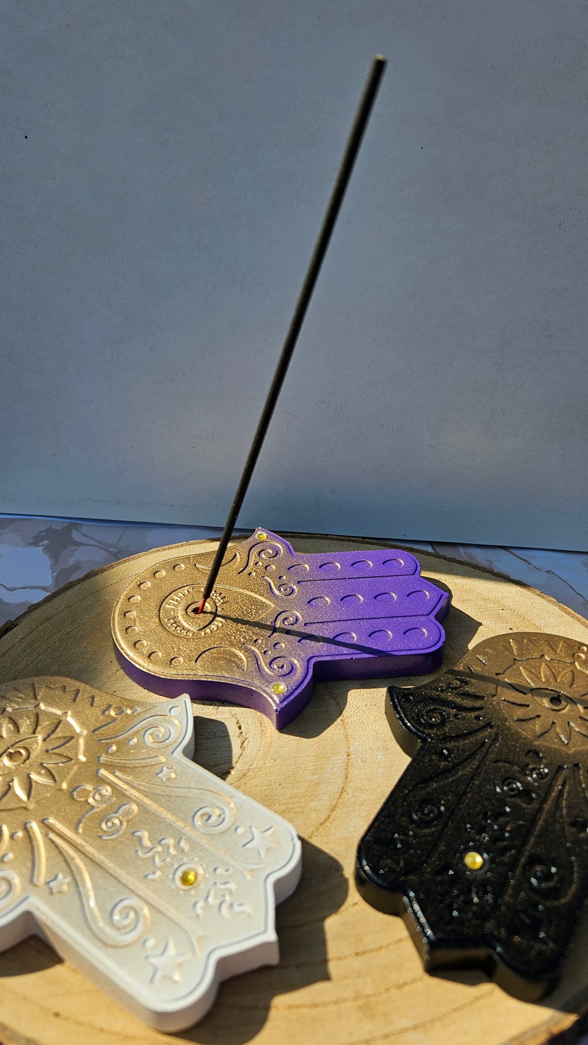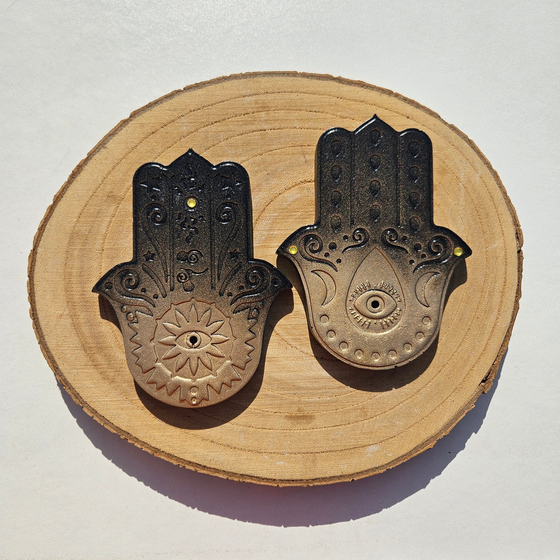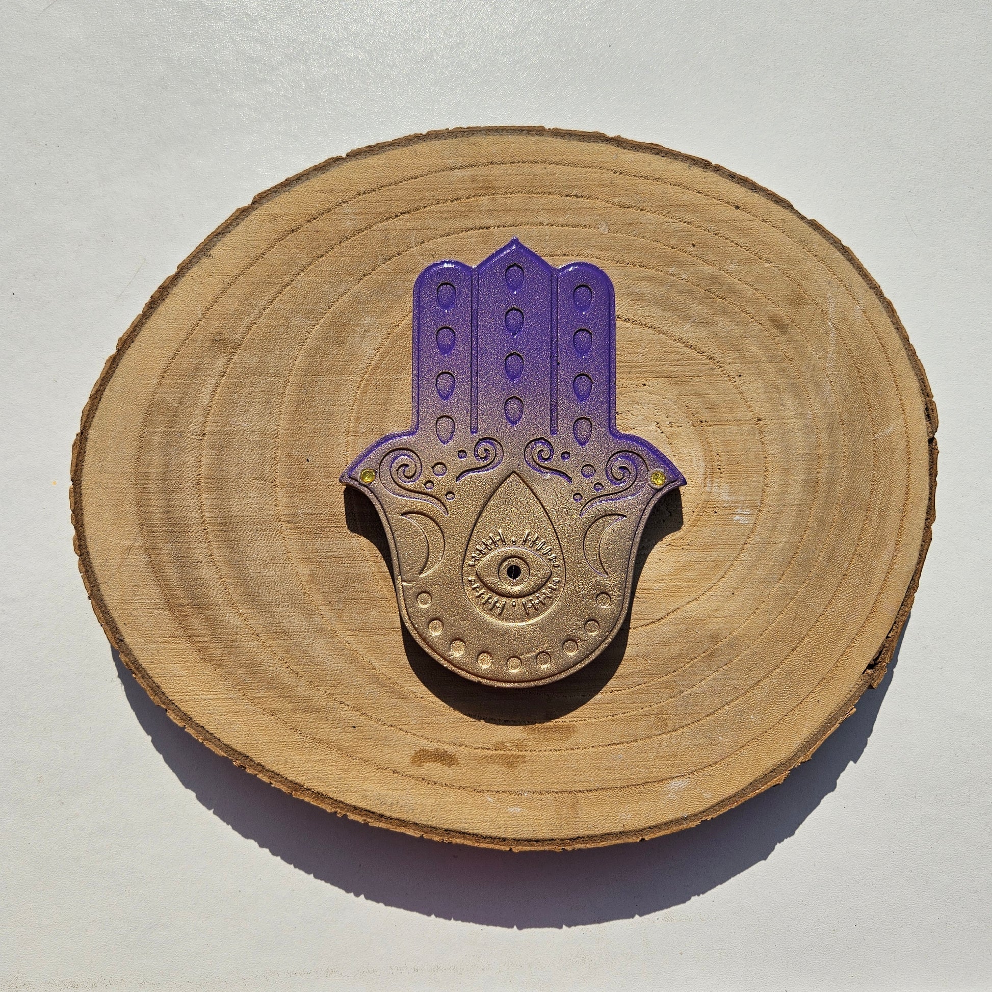 Porta incienso en forma de Mano de Fátima hecho y pintado a mano. Las medidas son: Ancho de 7 cm y altura de 12,5 cm.