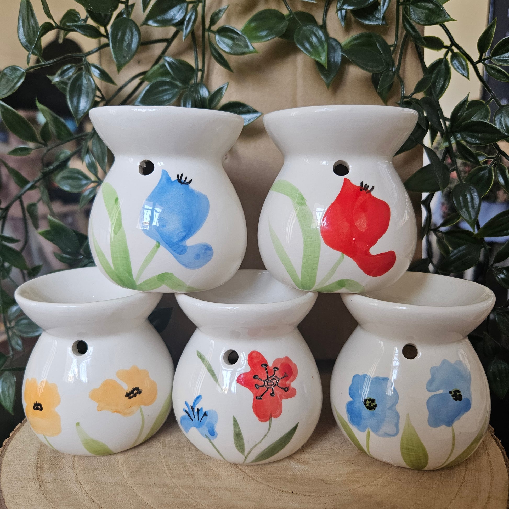 Quemador estilo floral blanco por la parte delantera y decorado con flores en la parte trasera.