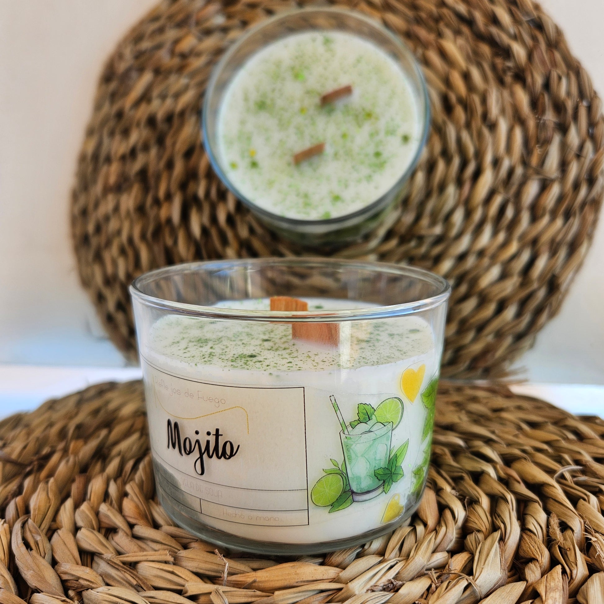 Cera de soja 100% natural, vegana y cruelty free, esencias aromáticas sin parabenos y mecha de madera.